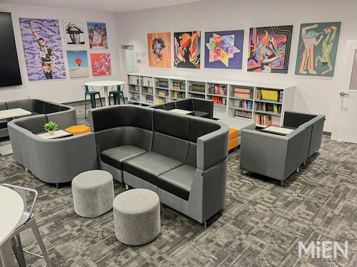 Designed and outfitted by MiEN and Meteor Schooling, the Empowerment Middle is the place children go to hang around, collaborate, and/or take part in class membership actions. The hub can be arrange with two wellness rooms the place college students can go to debrief and disconnect from an extended day or simply the stresses of being a pupil. It’s there for the scholars’ use.