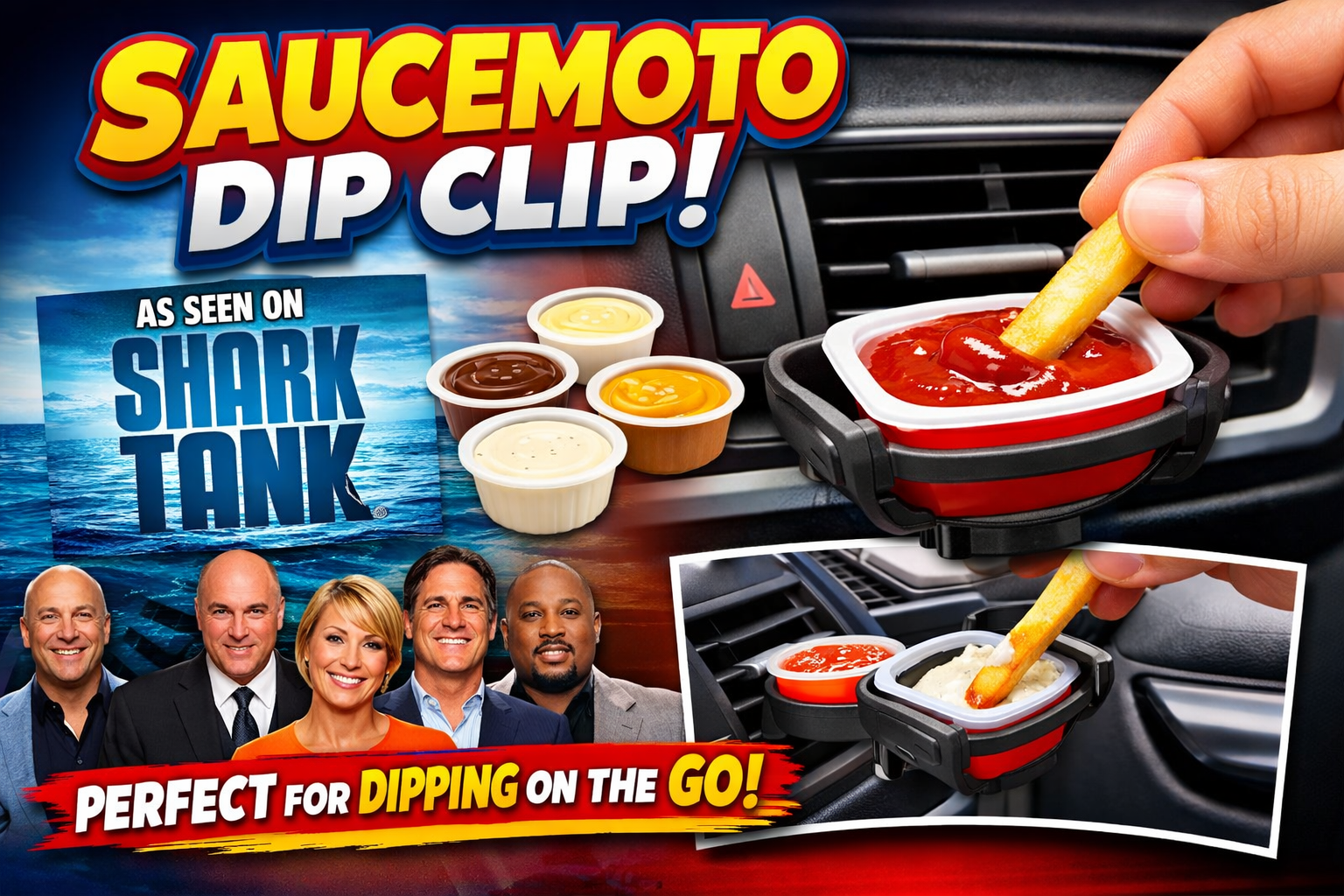 If you love eating on the go, you already know the struggle: balancing your fries, burger, and a sauce cup while driving or sitting in the passenger seat. Spills are messy, unsafe, and just plain frustrating. That’s exactly the problem Saucemoto Dip Clip solves—an innovative car accessory that gained national attention after appearing on Shark Tank.